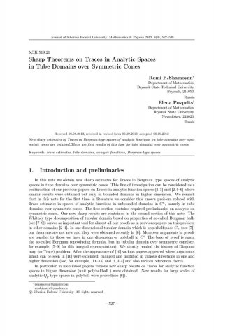 Библиографическое описание:Shamoyan, Romi. Sharp Theorems on Traces in Analytic Spaces in Tube Domains over Symmetric Cones = Точные теоремы о следах в аналитических пространствах в трубчатых областях над симметрическими конусами / R. F. Shamoyan, E. Povprits. - Текст : непосредственный // Журнал Сибирского федерального университета. Математика и физика. - 2013. - Т. 6, № 4. - С. 527-538. - Библиогр.: с. 537-538. - ISSN 1997-1397.