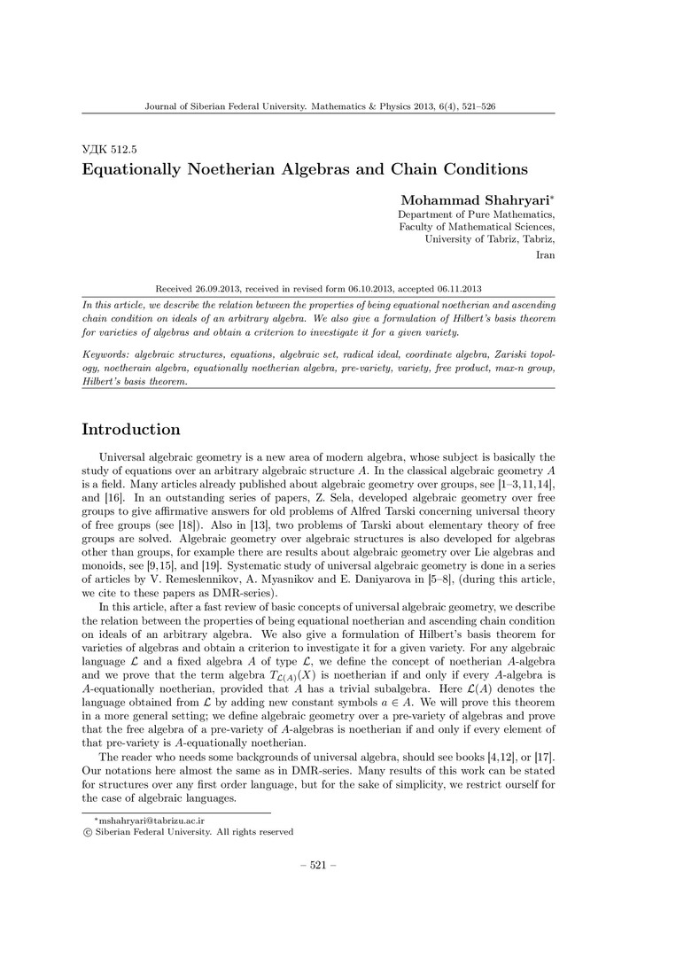 Библиографическое описание:Shahryari, Mohammad. Equationally Noetherian Algebras and Chain Conditions = Эквационально нетеровы алгебры и цепные условия / M. Shahryari. - Текст : непосредственный // Журнал Сибирского федерального университета. Математика и физика. - 2013. - Т. 6, № 4. - С. 521-526. - Библиогр.: с. 525-526. - ISSN 1997-1397.