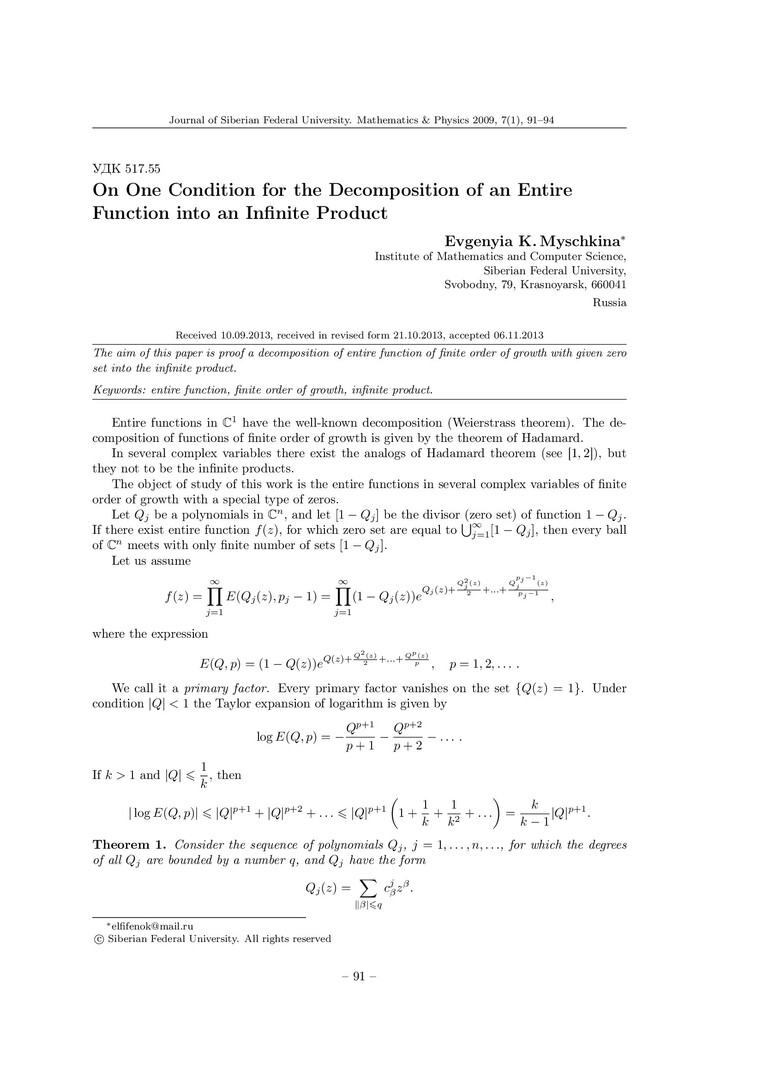 Библиографическое описание:Myschkina, Evgenyia. On One Condition for the Decomposition of an Entire Function into an Infinite Product = Об одном условии разложения целой функции в бесконечное произведение / E. K. Myschkina. - Текст : непосредственный // Журнал Сибирского федерального университета. Математика и физика. - 2014. - Т. 7, № 1. - С. 91-94. - Библиогр.: с. 94. - ISSN 1997-1397.