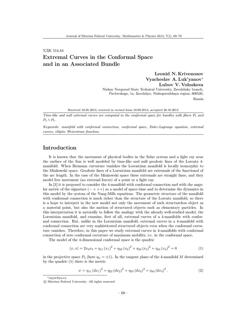 Библиографическое описание:Krivonosov, Leonid. Extremal Curves in the Conformal Space and in an Associated Bundle = Экстремальные кривые конформного пространства и одного из связанных с ним расслоений / L. N. Krivonosov, V. A. Lukyanov, L. V. Voloskova. - Текст : непосредственный // Журнал Сибирского федерального университета. Математика и физика. - 2014. - Т. 7, № 1. - С. 68-78. - Библиогр.: с. 77-78. - ISSN 1997-1397.