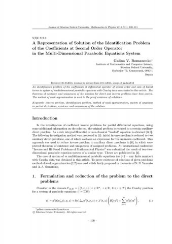 Библиографическое описание:Romanenko, Galina. A Representation of Solution of the Identification Problem of the Coefficients at Second Order Operator in the Multi-Dimensional Parabolic Equations System = О представлении решения задачи идентификации коэффициентов при дифференциальном операторе второго порядка в системе многомерных параболических уравнений / G. V. Romanenko. - Текст : непосредственный // Журнал Сибирского федерального университета. Математика и физика. - 2014. - Т. 7, № 1. - С. 100-111. - Библиогр.: с. 111. - ISSN 1997-1397.