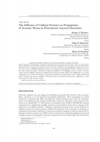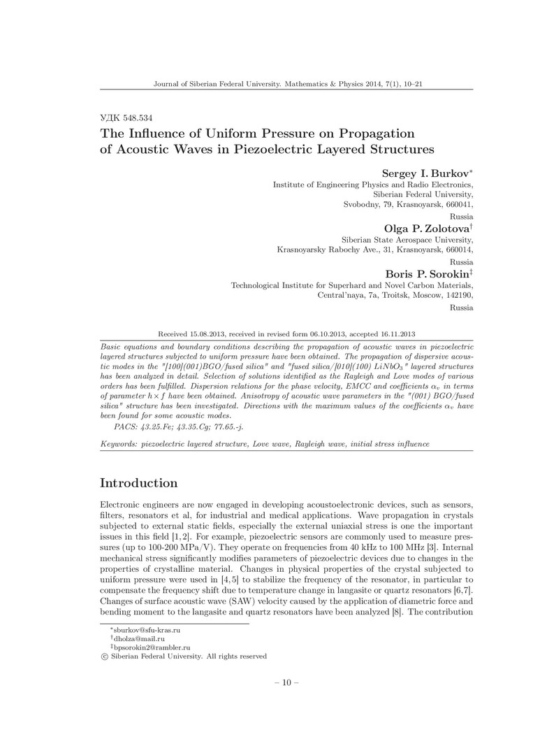 Аннотация:Получены основные уравнения и граничные условия для описания распространения акустических волн в пьезоэлектрических слоистых структурах в условиях действия одноосного давления.