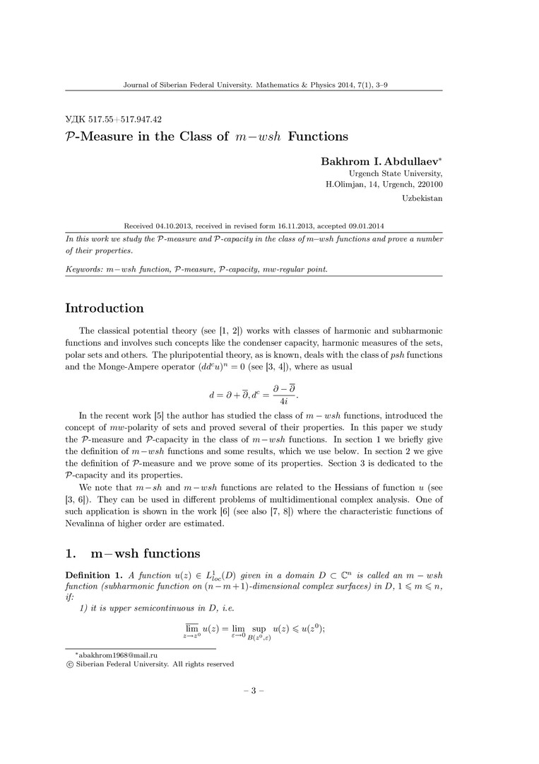 Аннотация:В данной работе изучена P-мера и P-емкость в классе m wsh функций, также доказаны их некоторые свойства.