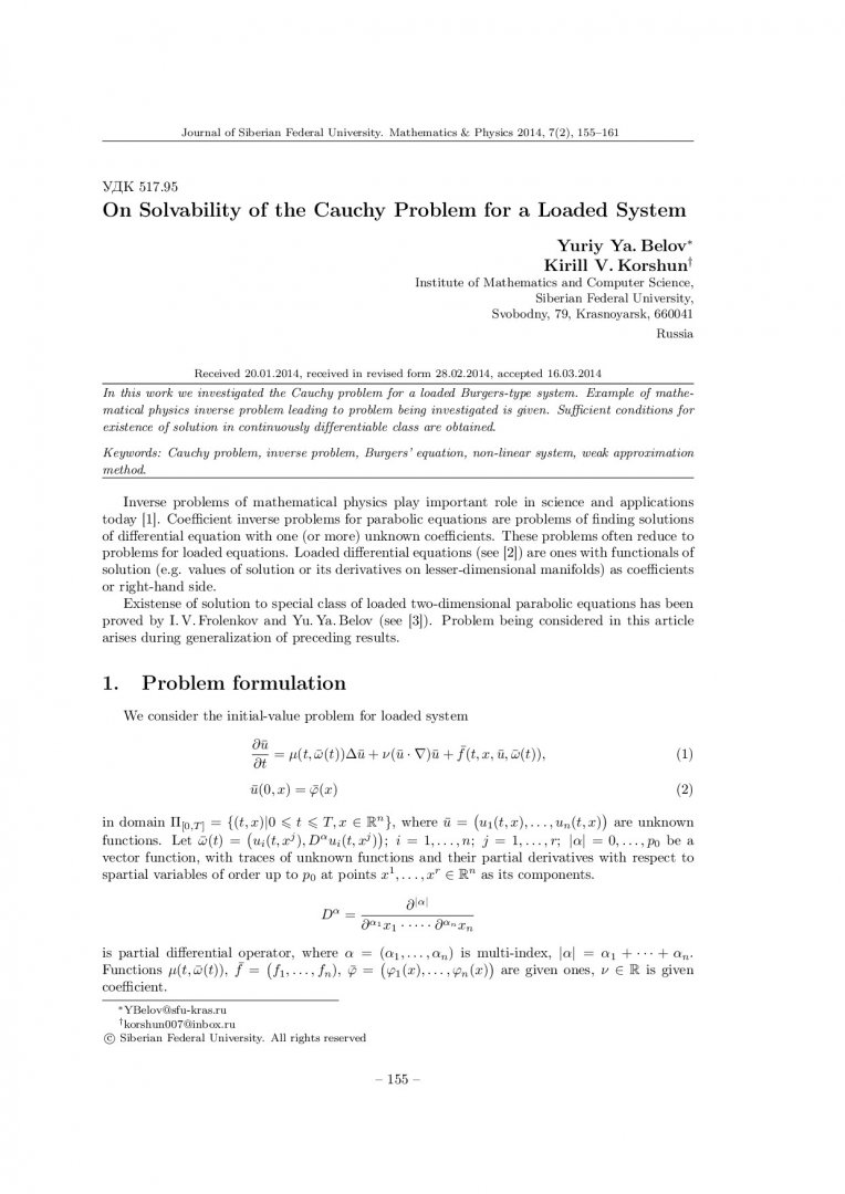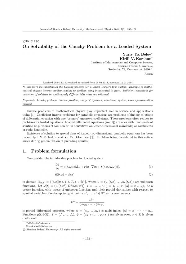 Библиографическое описание:Belov, Yu. Ya. On Solvability of the Cauchy Problem for a Loaded System = О разрешимости задачи Коши для системы нагруженных уравнений / Yu. Ya. Belov, K. V. Korshun. - Текст : непосредственный // Журнал Сибирского федерального университета. Математика и физика. - 2014. - Т. 7, № 2. - С. 155-161. - Библиогр.: с. 160. - ISSN 1997-1397.