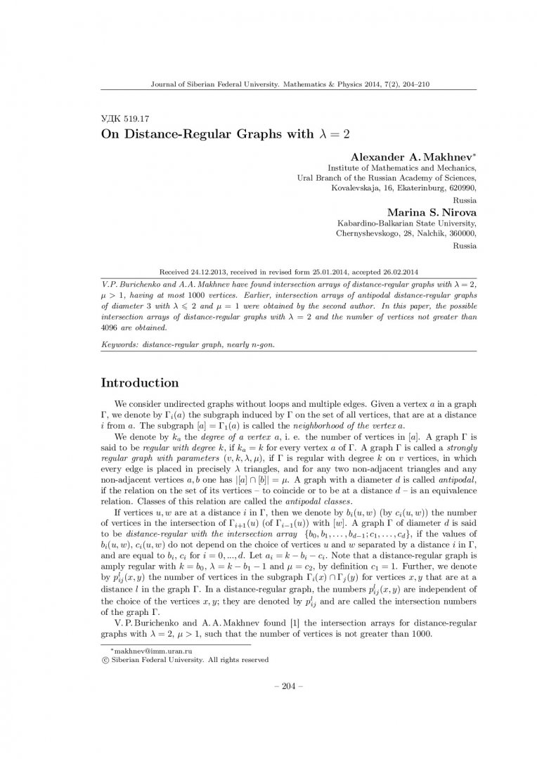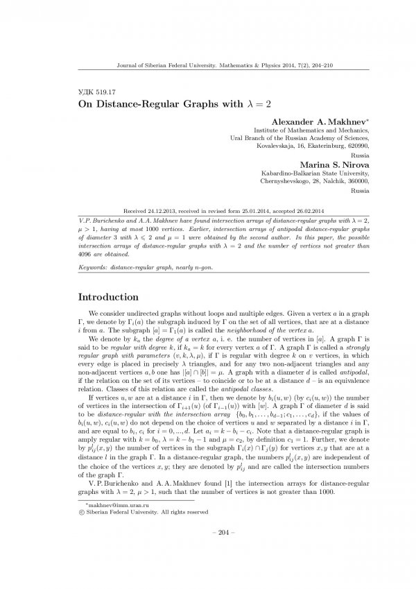 Библиографическое описание:Makhnev, A. A. On Distance-Regular Graphs with Lambda = 2 / A. A. Makhnev, M. S. Nirova. - Текст : непосредственный // Журнал Сибирского федерального университета. Математика и физика. - 2014. - Т. 7, № 2. - С. 204-210. - Библиогр.: с. 210. - ISSN 1997-1397.