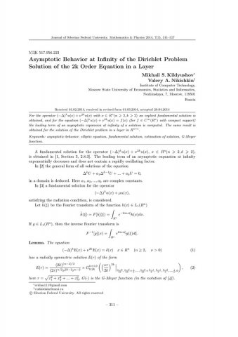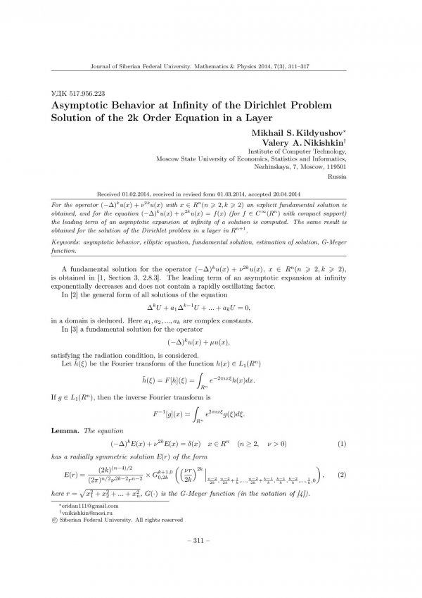 Библиографическое описание:Kildyushov, Mikhail. Asymptotic Behavior at Infinity of the Dirichlet Problem Solution of the 2k Order Equation in a Layer = Об асимптотике решения задачи Дирихле для уравнения порядка 2k в слое / M. S. Kildyushov, V. A. Nikishkin. - Текст : непосредственный // Журнал Сибирского федерального университета. Математика и физика. - 2014. - Т. 7, № 3. - С. 311-317. - Библиогр.: с. 317 (9 назв.). - ISSN 1997-1397.
