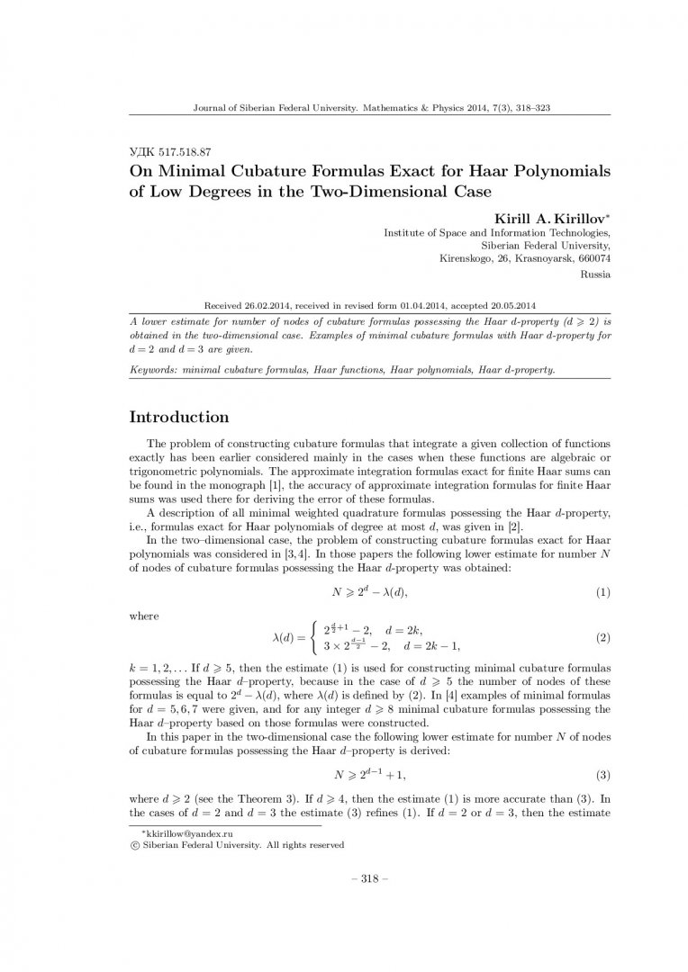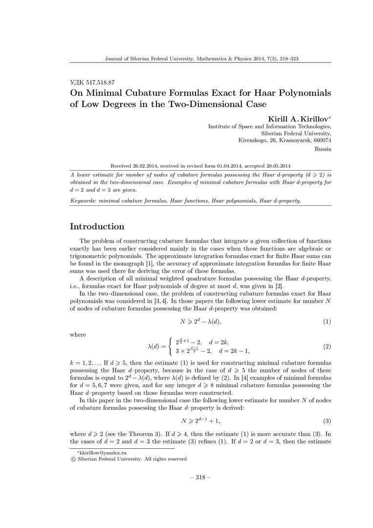 Библиографическое описание:Kirillov, Kirill. On Minimal Cubature Formulas Exact for Haar Polynomials of Low Degrees in the Two-Dimensional Case = О минимальных кубатурных формулах, точных для полиномов Хаара малых степеней в двумерном случае / K. A. Kirillov. - Текст : непосредственный // Журнал Сибирского федерального университета. Математика и физика. - 2014. - Т. 7, № 3. - С. 318-323. - Библиогр.: с. 323 (7 назв.). - ISSN 1997-1397.