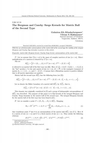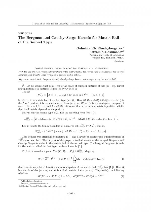 Библиографическое описание:Khudayberganov, Gulmirza. The Bergman and Cauchy–Szego Kernels for Matrix Ball of the Second Type = Ядра Бергмана и Коши-Сеге для матричного шара второго типа / G. Kh. Khudayberganov, U. S. Rakhmonov. - Текст : непосредственный // Журнал Сибирского федерального университета. Математика и физика. - 2014. - Т. 7, № 3. - С. 305-310. - Библиогр.: с. 310 (7 назв.). - ISSN 1997-1397.