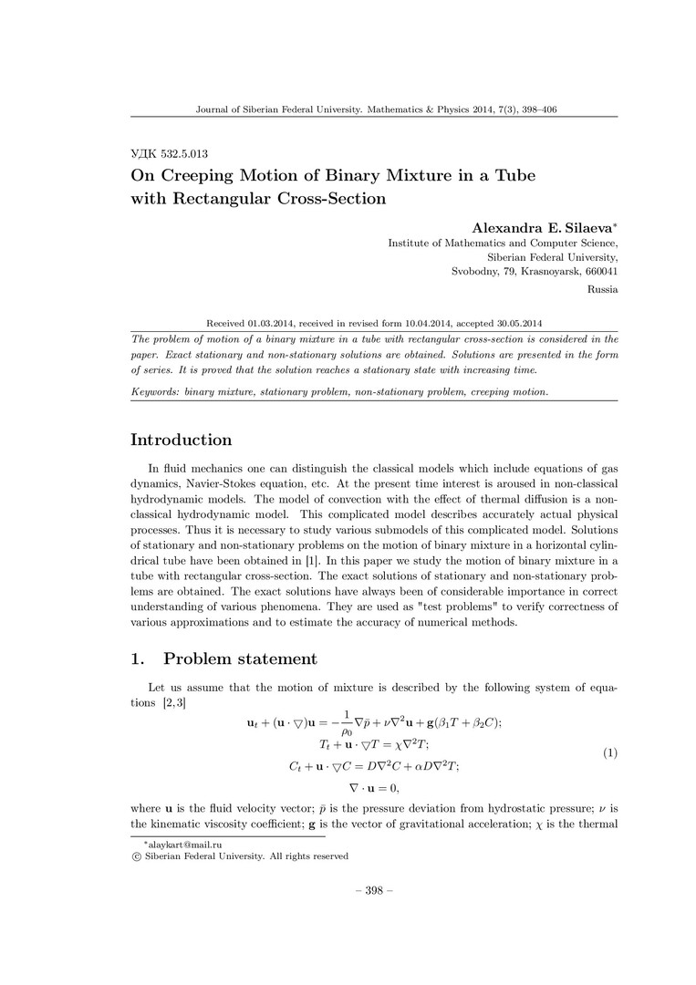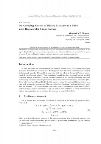 Аннотация:В работе дана постановка задачи движения бинарной смеси в трубе прямоугольного сечения. Получены точные решения стационарной и нестационарной задач в виде рядов. Доказано, что с ростом времени решение выходит на стационарный режим.