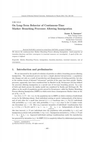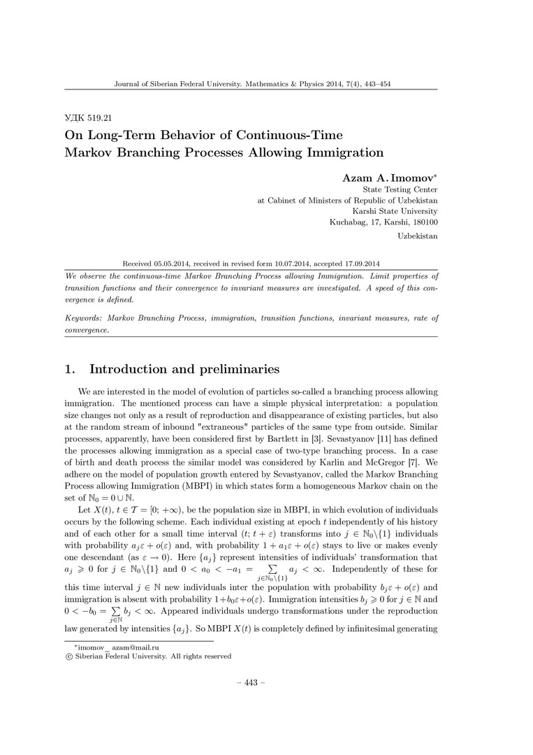 Библиографическое описание:Imomov, Azam. On Long-Term Behavior of Continuous-Time Markov Branching Processes Allowing Immigration = О предельном поведении марковских ветвящихся процессов с иммиграцией непрерывного времени / A. A. Imomov. - Текст : непосредственный // Журнал Сибирского федерального университета. Математика и физика. - 2014. - Т. 7, № 4. - С. 443-454. - Библиогр.: с. 454. - ISSN 1997-1397.
