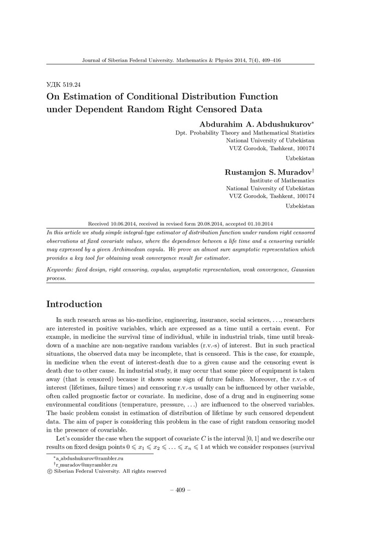 Библиографическое описание:Abdushukurov, Abdurahim. On Estimation of Conditional Distribution Function under Dependent Random Right Censored Data = Об оценивании условной функции распределения при зависимом случайном цензурировании справа / A. A. Abdushukurov, R. S. Muradov. - Текст : непосредственный // Журнал Сибирского федерального университета. Математика и физика. - 2014. - Т. 7, № 4. - С. 409-416. - Библиогр.: с. 415-416. - ISSN 1997-1397.