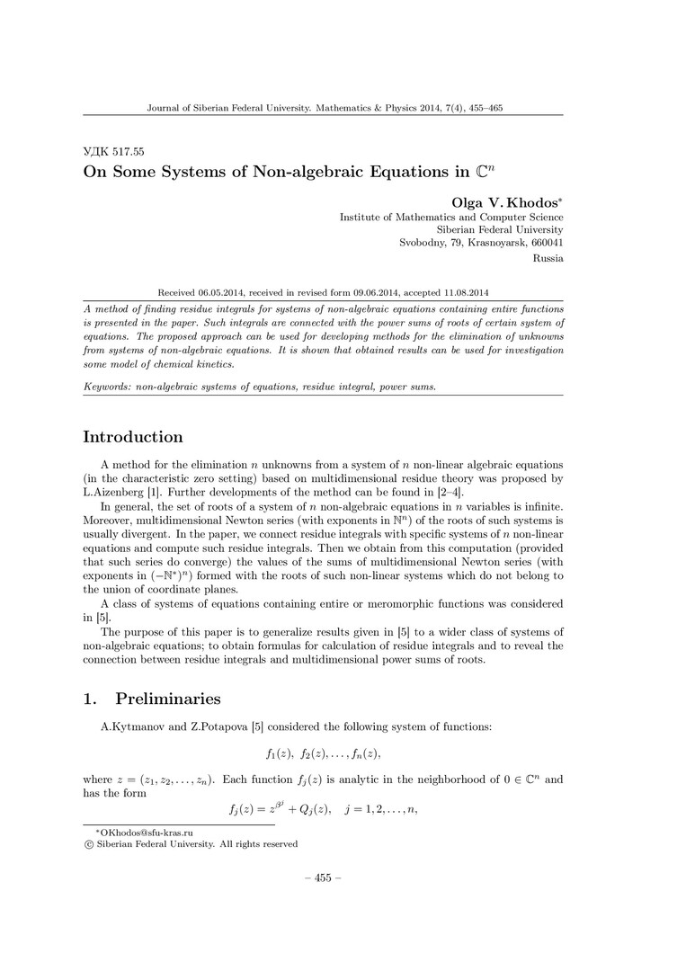 Библиографическое описание:Khodos, Olga. On Some Systems of Non-algebraic Equations in Cn = О некоторых системах неалгебраических уравнений в Cn / O. V. Khodos. - Текст : непосредственный // Журнал Сибирского федерального университета. Математика и физика. - 2014. - Т. 7, № 4. - С. 455-465. - Библиогр.: с. 465. - ISSN 1997-1397.