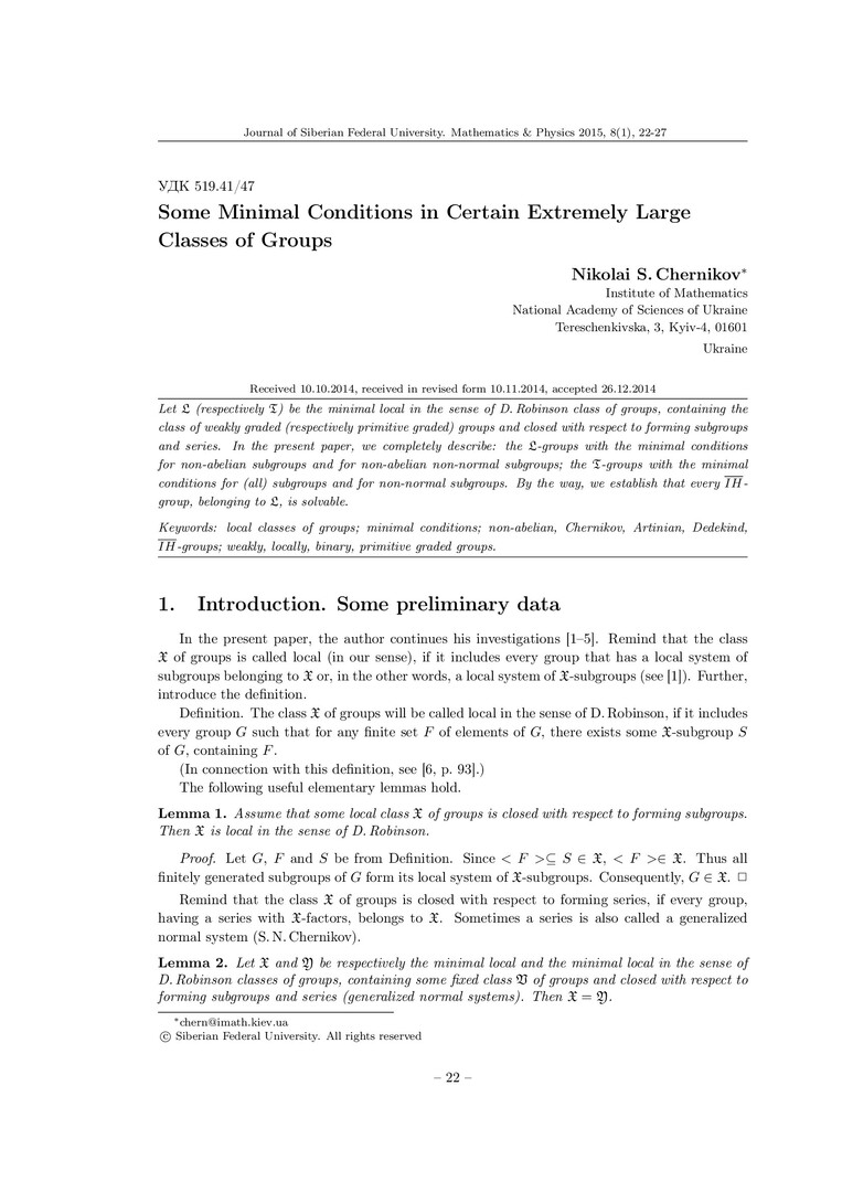 Библиографическое описание:Chernikov, Nikolai. Some Minimal Conditions in Certain Extremely Large Classes of Groups = Некоторые условия минимальности в некоторых экстремально больших классах групп / N. S. Chernikov. - Текст : непосредственный // Журнал Сибирского федерального университета. Математика и физика. - 2015. - Т. 8, № 1. - С. 22-27. - Библиогр.: с. 26-27. - ISSN 1997-1397.
