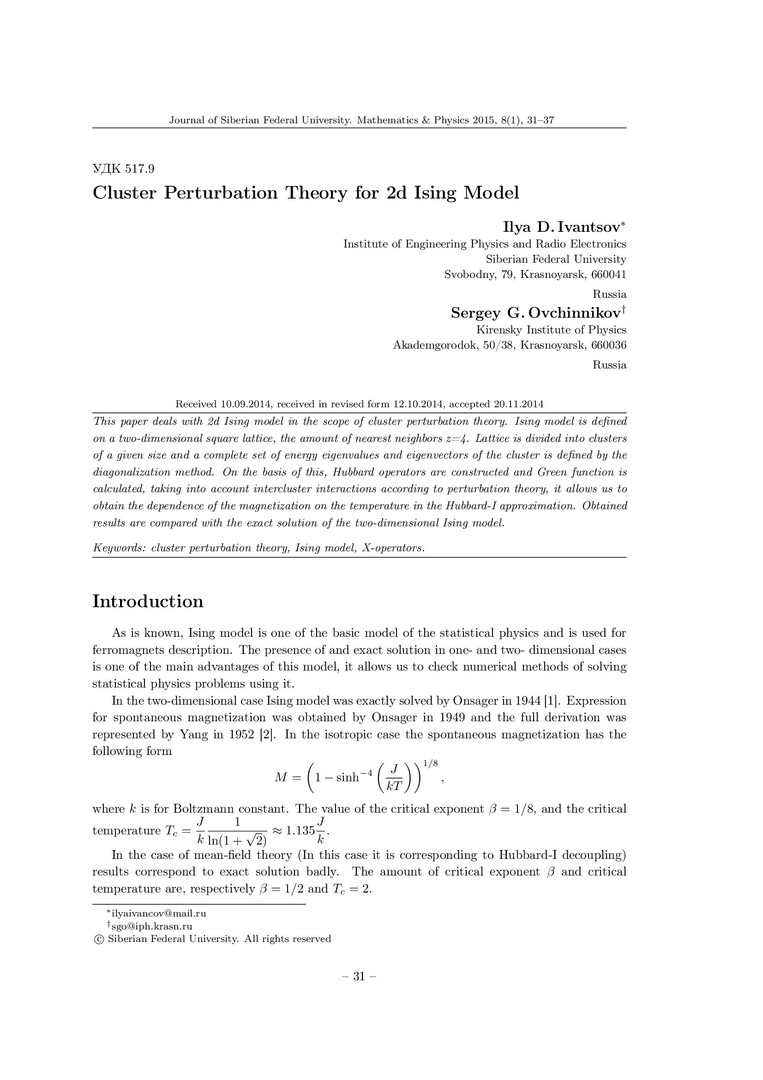 Библиографическое описание:Ivantsov, Ilya. Cluster Perturbation Theory for 2d Ising Model = Кластерная теория возмущений для двумерной модели Изинга / I. D. Ivantsov, S. G. Ovchinnikov. - Текст : непосредственный // Журнал Сибирского федерального университета. Математика и физика. - 2015. - Т. 8, № 1. - С. 31-37. - Библиогр.: с. 37. - ISSN 1997-1397.