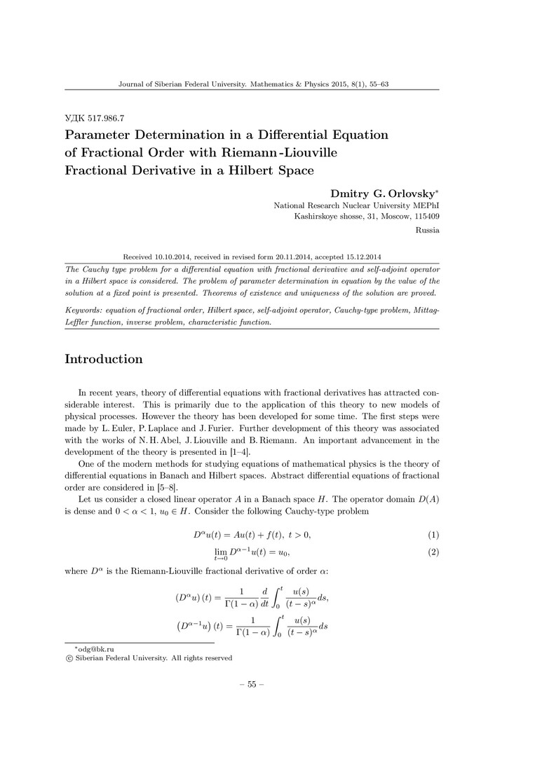 Библиографическое описание:Orlovsky, Dmitry. Parameter Determination in a Differential Equation of Fractional Order with Riemann -Liouville Fractional Derivative in a Hilbert Space = Определение параметра дифференциального уравнения дробного порядка с производной Римана -Лиувилля в гильбертовом пространстве / D. G. Orlovsky. - Текст : непосредственный // Журнал Сибирского федерального университета. Математика и физика. - 2015. - Т. 8, № 1. - С. 55-63. - Библиогр.: с. 62-63. - ISSN 1997-1397.