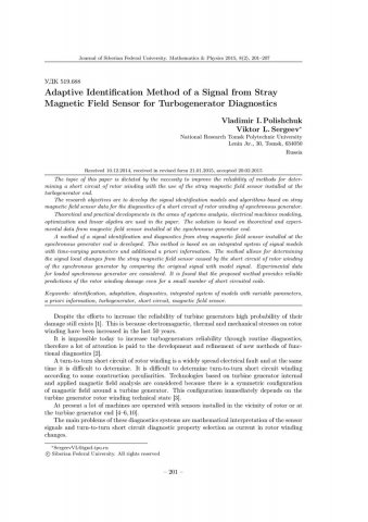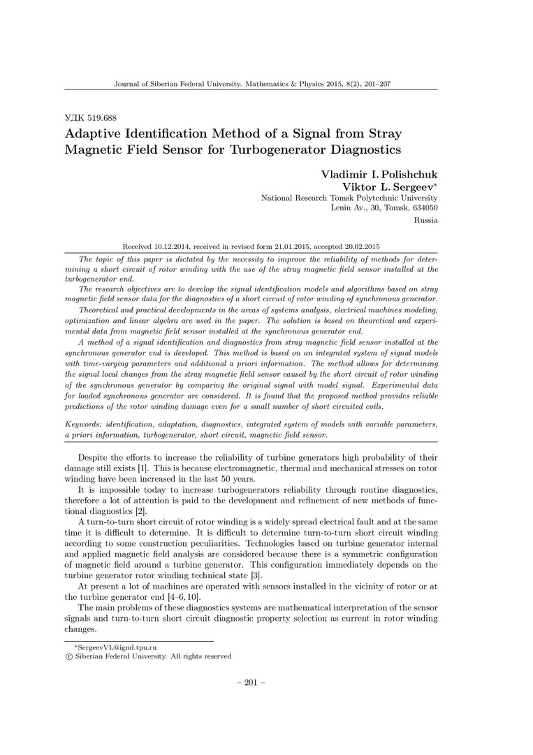 Библиографическое описание:Polishchuk, Vladimir. Adaptive Identification Method of a Signal from Stray Magnetic Field Sensor for Turbogenerator Diagnostics = Метод адаптивной идентификации сигнала с датчика магнитного поля рассеяния для диагностики турбогенератора / V. I. Polishchuk, V. L. Sergeev. - Текст : непосредственный // Журнал Сибирского федерального университета. Математика и физика. - 2015. - Т. 8, № 2. - С. 201-207. - Библиогр.: с. 206. - ISSN 1997-1397.