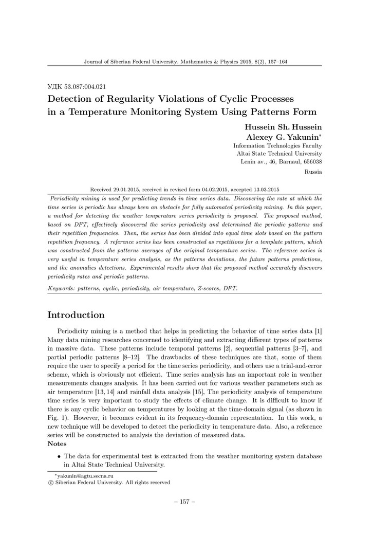 Аннотация:В данной статье предлагается метод для выделения периодических циклов на графиках изменения температуры окружающей среды. Основанный на дискретном преобразовании Фурье, он эффективно выделяет периодические участки и частоту их повторения. Экспериментальные результаты показывают, что предложенный метод точно находит длительность периода и форму циклически повторяющихся фрагментов ряда.