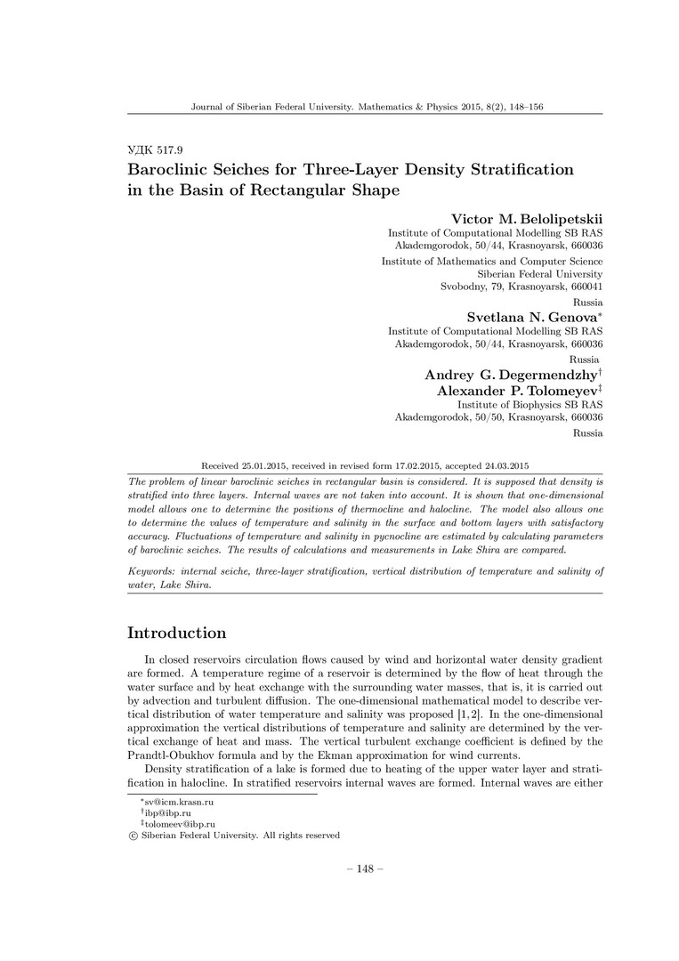 Библиографическое описание: Baroclinic Seiches for Three-Layer Density Stratification in the Basin of Rectangular Shape = Бароклинные сейши в случае трехслойной плотностной стратификации в бассейнах прямоугольной формы / V. M. Belolipetskii [и др.]. - Текст : непосредственный // Журнал Сибирского федерального университета. Математика и физика. - 2015. - Т. 8, № 2. - С. 148-156. - Библиогр.: с. 155-156. - ISSN 1997-1397.