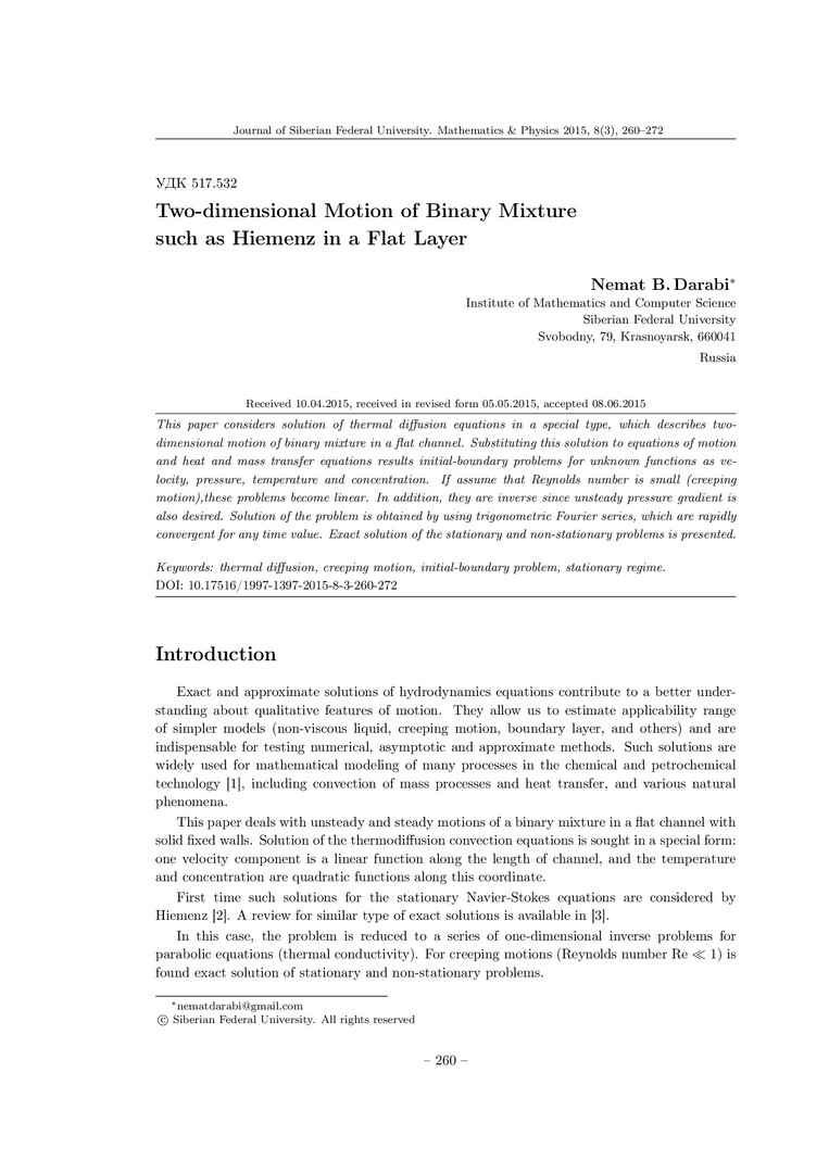 Аннотация:В статье рассматривается решение уравнений термодиффузии специального вида, описывающее двумерное движение в плоском канале. После подстановки этого решения в уравнения движения тепломассопереноса возникают начально-краевые задачи для неизвестных функций скорости, давления, температуры и концентрации.