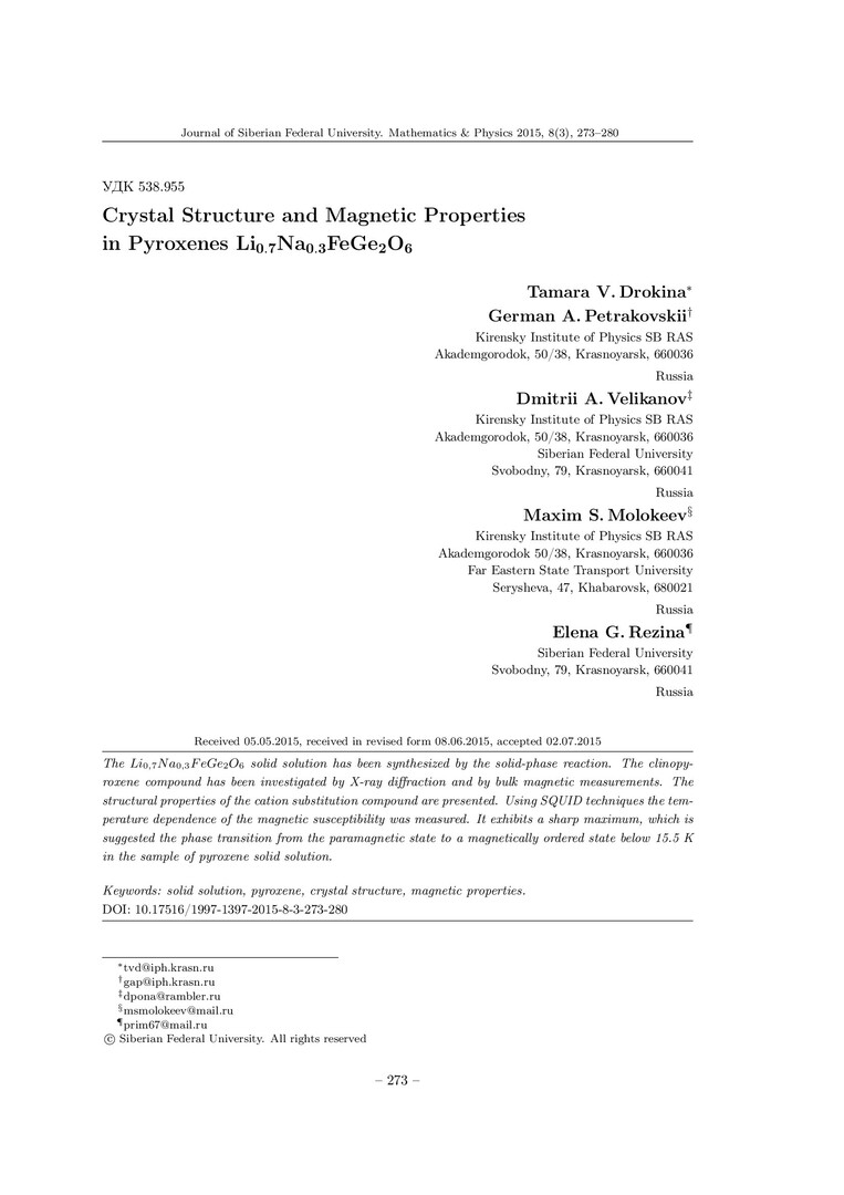 Библиографическое описание:Crystal Structure and Magnetic Properties in Pyroxenes Li0.7Na0.3FeGe2O6 = Структурные и магнитные свойства пироксена Li0.7Na0.3FeGe2O6 / T. V. Drokina [et al.]. - Текст : непосредственный // Журнал Сибирского федерального университета. Математика и физика. - 2015. - Т. 8, № 3. - С. 273-290. - Библиогр.: с. 279-280. - ISSN 1997-1397.