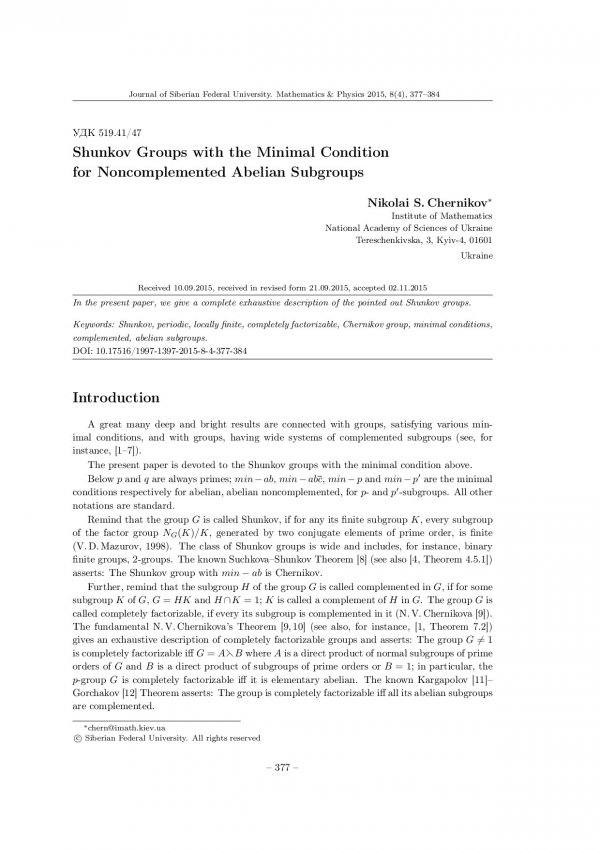 Библиографическое описание:Chernikov, N. S. Shunkov Groups with the Minimal Condition for Noncomplemented Abelian Subgroups = Шунковские группы с условием минимальности для недополняемых абелевых погрупп / N. S. Chernikov. - Текст : непосредственный // Журнал Сибирского федерального университета. Математика и физика. - 2015. - Т. 8, № 4. - С. 377-384. - Библиогр.: с. 383-384. - ISSN 1997-1397.