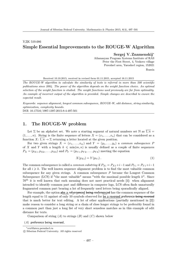 Аннотация:Алгоритм ROUGE-W для вычисления схожести текстов с 2004 года упоминается почти в 500 научных публикациях. Представлен оптимальный выбор весовой функции, от которой зависит эффективность алгоритма. Ранее использовались функции, далёкие от оптимальной. Приведён пример некорректного срабатывания алгоритма. Описаны несложные изменения в нём, гарантирующие ожидаемый результат.