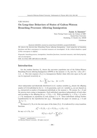 Библиографическое описание:Imomov, A. A. On Long-time Behaviors of States of Galton-Watson Branching Processes Allowing Immigration = Об асимптотическом поведении состояний ветвящихся процессов Гальтона-Ватсона с иммиграцией / A. A. Imomov. - Текст : непосредственный // Журнал Сибирского федерального университета. Математика и физика. - 2015. - Т. 8, № 4. - С. 394-405. - Библиогр.: с. 404-405. - ISSN 1997-1397.