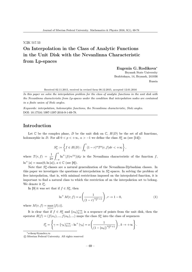 Библиографическое описание:Rodikova, Eugenia. On Interpolation in the Class of Analytic Functions in the Unit Disk with the Nevanlinna Characteristic from Lp-spaces = Об интерполяции в классах аналитических в круге функций с характеристикой Р. Неванлинны из Lp-весовых пространств / E. G. Rodikova. - Текст : непосредственный // Журнал Сибирского федерального университета. Математика и физика. - 2016. - Т. 9, № 1. - С. 69-78. - Библиогр.: с. 77-78. - ISSN 1997-1397.