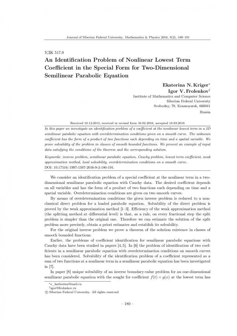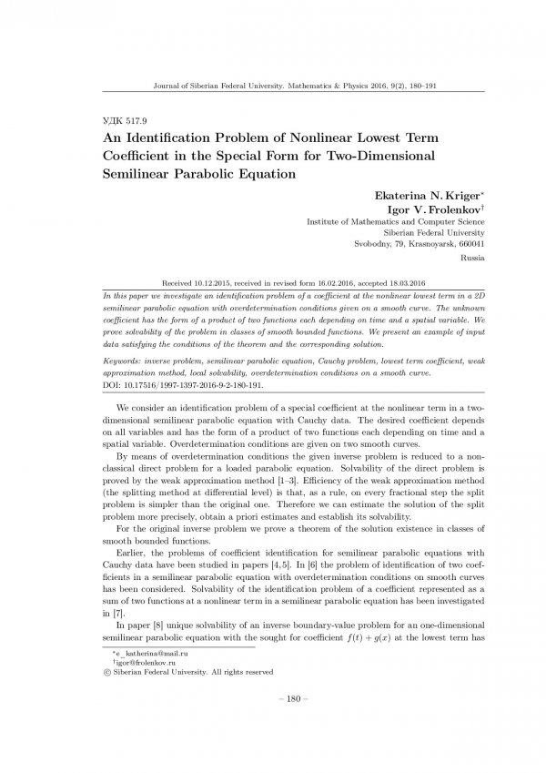 Библиографическое описание:Kriger, Ekaterina. An Identification Problem of Nonlinear Lowest Term Coefficient in the Special Form for Two-Dimensional Semilinear Parabolic Equation = Об одной задаче идентификации коэффициента специального вида при нелинейном младшем члене в двумерном полулинейном параболическом уравнении / E. N. Kriger, I. V. Frolenkov. - Текст : непосредственный // Журнал Сибирского федерального университета. Математика и физика. - 2016. - Т. 9, № 2. - С. 180-191. - Библиогр.: с. 190-191. - ISSN 1997-1397.