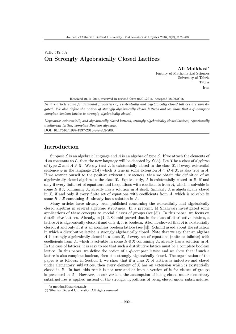 Аннотация:В этой статье исследованы некоторые фундаментальные свойства экзистенциально и алгебраически замкнутых решеток. Определено также понятие сильно алгебраически замкнутой решетки.