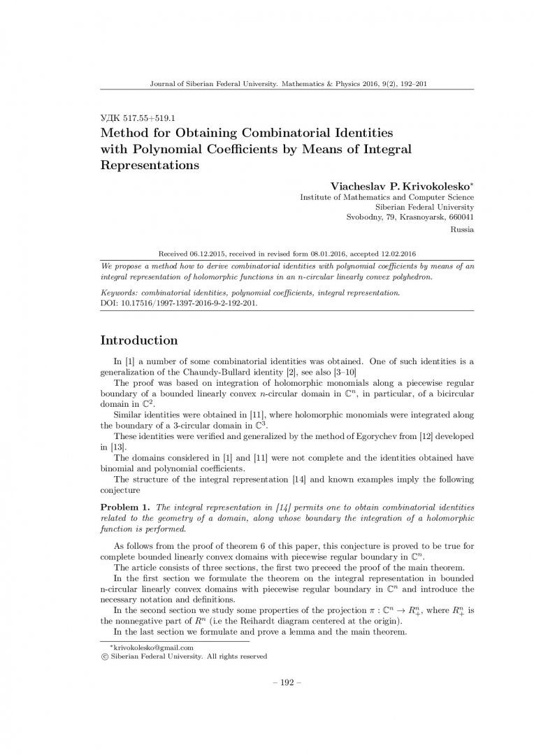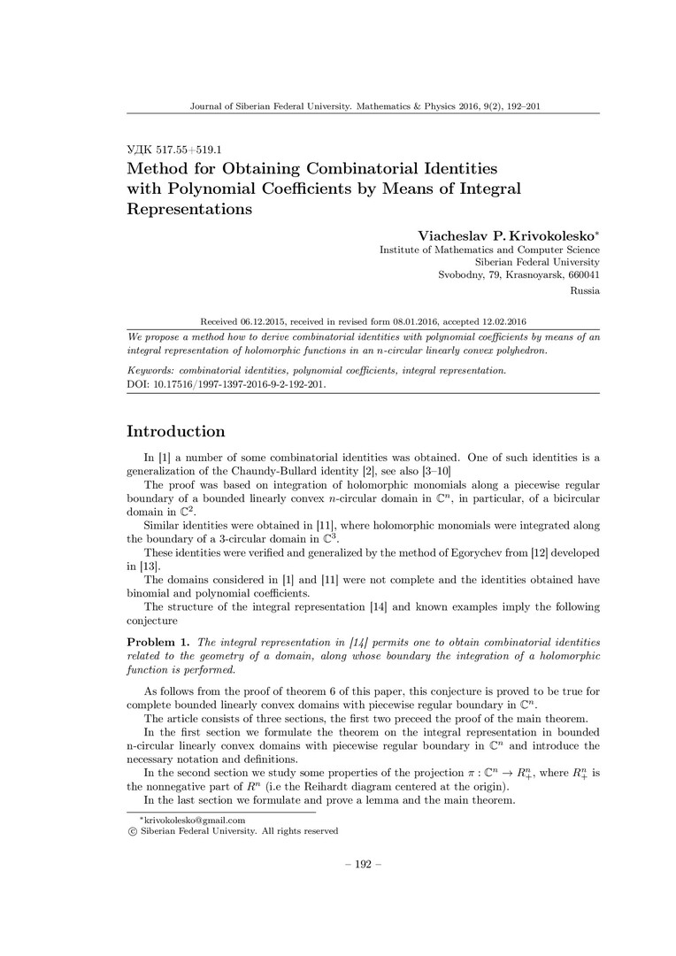 Библиографическое описание:Krivokolesko, Viacheslav. Method for Obtaining Combinatorial Identities with Polynomial Coefficients by Means of Integral Representations = Получение комбинаторных тождеств с полиномиальными коэффициентами с помощью интегрального представления / V. P. Krivokolesko. - Текст : непосредственный // Журнал Сибирского федерального университета. Математика и физика. - 2016. - Т. 9, № 2. - С. 192-201. - Библиогр.: с. 200-201. - ISSN 1997-1397.