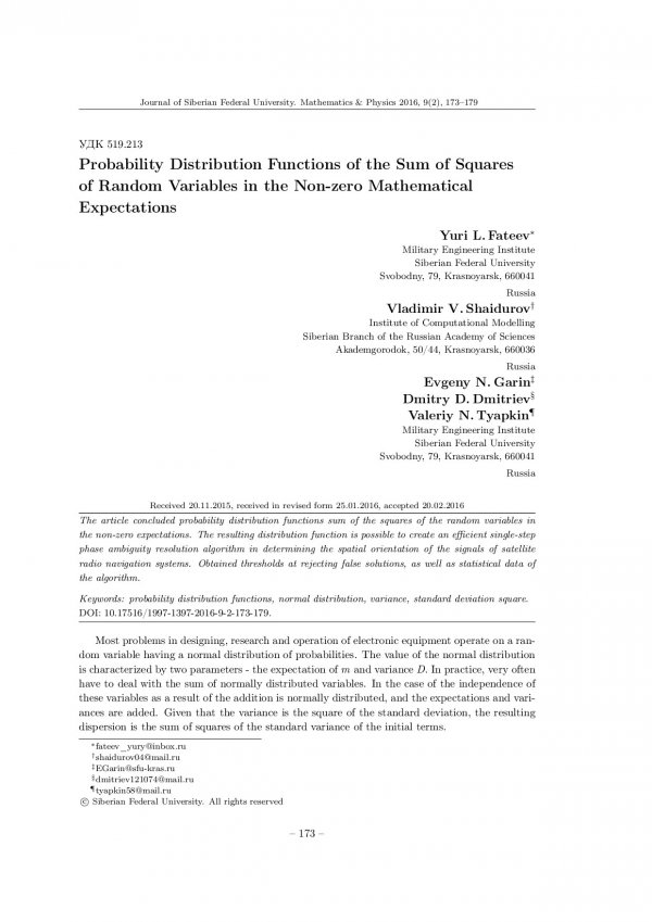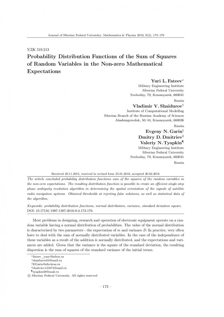 Библиографическое описание:Probability Distribution Functions of the Sum of Squares of Random Variables in the Non-zero Mathematical Expectations = Функция распределения плотности вероятностей суммы квадратов случайных величин при ненулевых математических ожиданиях / Yu. L. Fateev [et. al.]. - Текст : непосредственный // Журнал Сибирского федерального университета. Математика и физика. - 2016. - Т. 9, № 2. - С. 173-179. - Библиогр.: с. 178-179. - ISSN 1997-1397.
