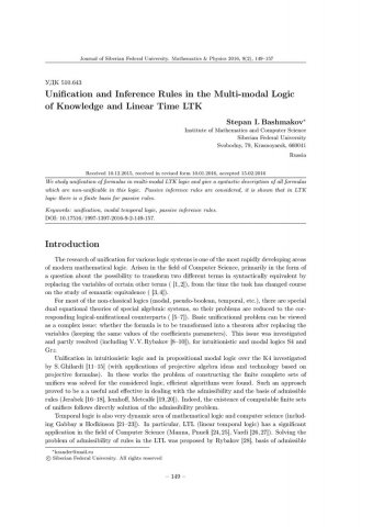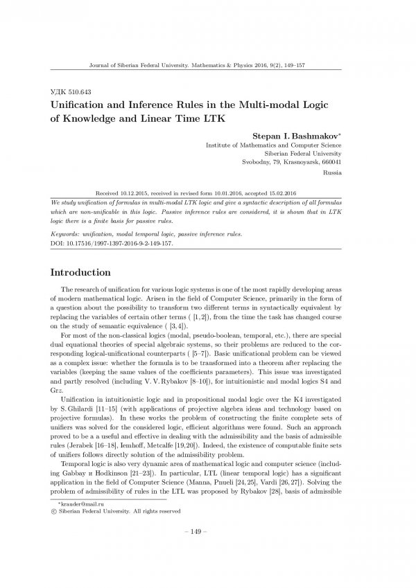 Библиографическое описание:Bashmakov, Stepan. Unification and Inference Rules in the Multi-modal Logic of Knowledge and Linear Time LTK = Унификация и правила вывода в многомодальной логике знания и линейного времени LTK / S. I. Bashmakov. - Текст : непосредственный // Журнал Сибирского федерального университета. Математика и физика. - 2016. - Т. 9, № 2. - С. 149-157. - Библиогр.: с. 155-157. - ISSN 1997-1397.