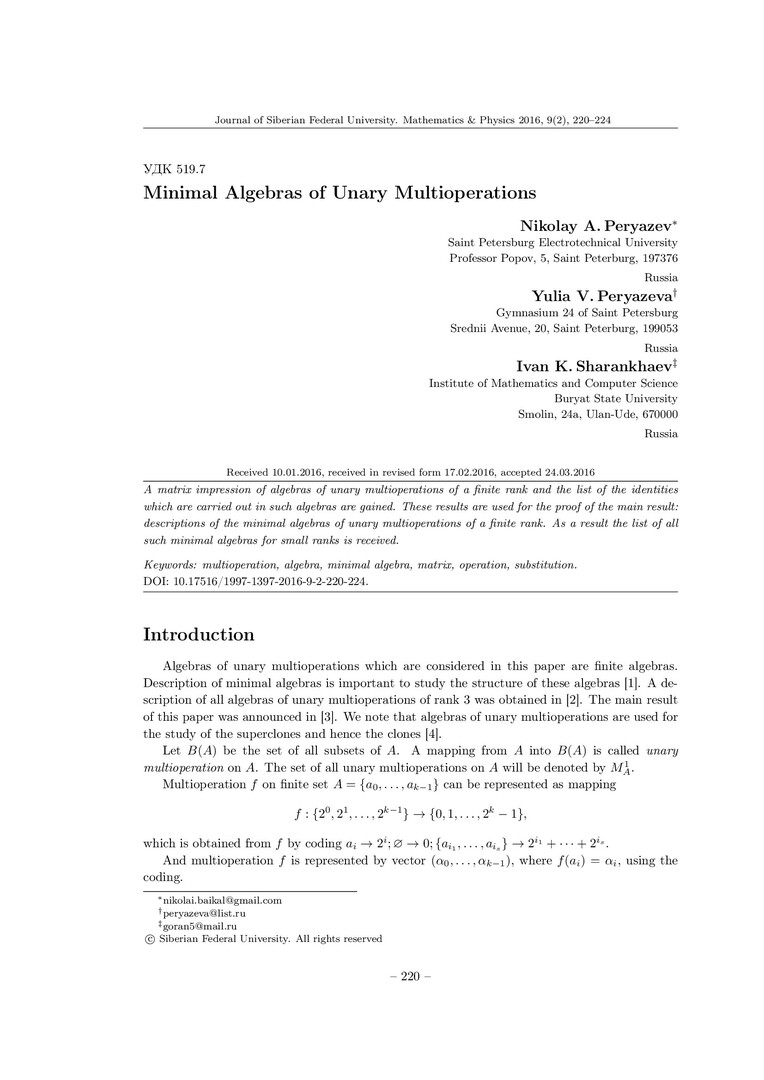 Библиографическое описание:Peryazev, Nikolay. Minimal Algebras of Unary Multioperations = Минимальные алгебры унарных мультиопераций / N. A. Peryazev, Yu. V. Peryazeva, I. K. Sharankhaev. - Текст : непосредственный // Журнал Сибирского федерального университета. Математика и физика. - 2016. - Т. 9, № 2. - С. 220-224. - Библиогр.: с. 224. - ISSN 1997-1397.