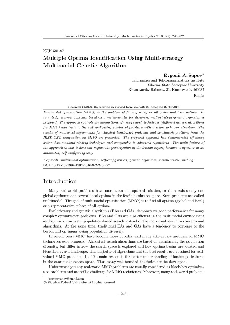 Библиографическое описание:Sopov, Evgenii. Multiple Optima Identification Using Multi-strategy Multimodal Genetic Algorithm = Идентификация множества экстремумов с помощью генетического алгоритма на основе многих стратегий мультимодального поиска / E. A. Sopov. - Текст : непосредственный // Журнал Сибирского федерального университета. Математика и физика. - 2016. - Т. 9, № 2. - С. 246-257. - Библиогр.: с. 255-256. - ISSN 1997-1397.