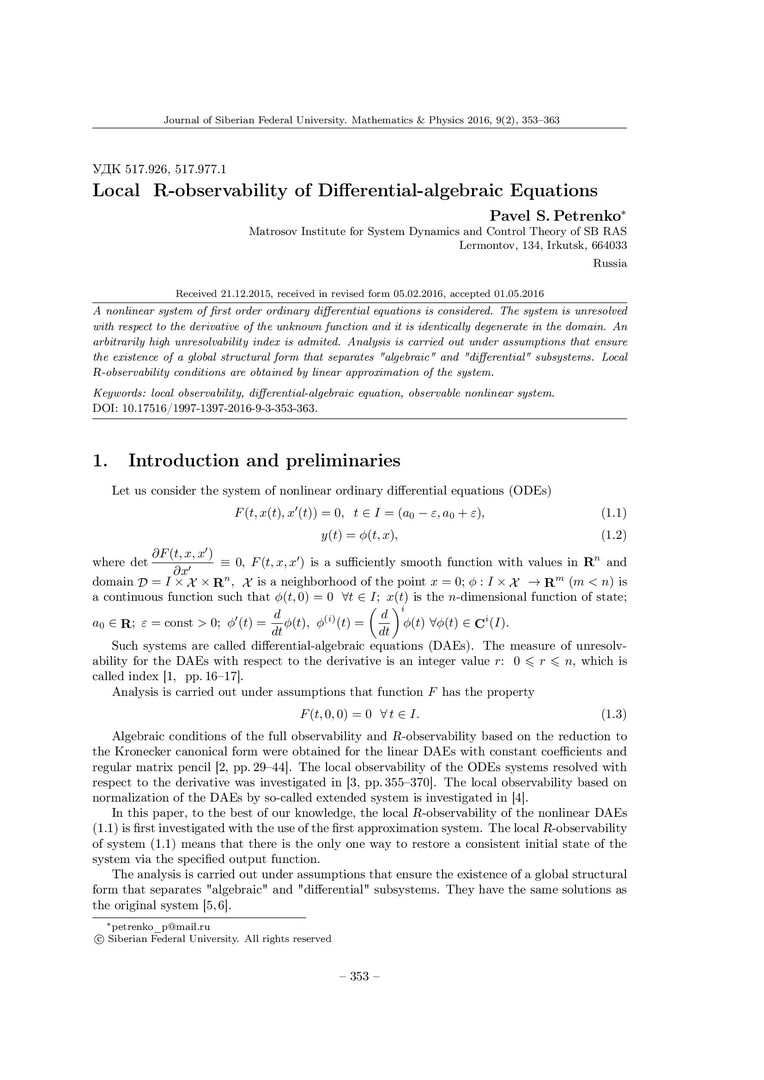 Библиографическое описание:Petrenko, Pavel. Local R-observability of Differential-algebraic Equations = Локальная R-наблюдаемость систем дифференциально- алгебраических уравнений / P. S. Petrenko. - Текст : непосредственный // Журнал Сибирского федерального университета. Математика и физика. - 2016. - Т. 9, № 3. - С. 353-363. - Библиогр.: с. 363. - ISSN 1997-1397.