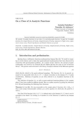 Библиографическое описание: Sadullaev, Azimbai. On a Class of A-Analytic Functions = Об одном классе A-аналитических функций / A. Sadullaev, N. M. Jabborov. - Текст : непосредственный // Журнал Сибирского федерального университета. Математика и физика. - 2016. - Т. 9, № 3. - С. 374-383. - Библиогр.: с. 383. - ISSN 1997-1397.