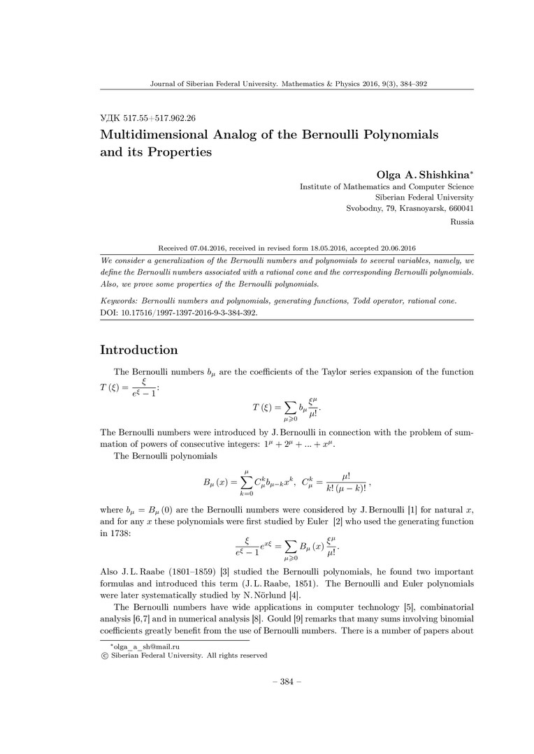 Библиографическое описание:Shishkina, Olga. Multidimensional Analog of the Bernoulli Polynomials and its Properties = Многомерный аналог многочленов Бернулли и его свойства / O. A. Shishkina. - Текст : непосредственный // Журнал Сибирского федерального университета. Математика и физика. - 2016. - Т. 9, № 3. - С. 384-392. - Библиогр.: с. 392. - ISSN 1997-1397.