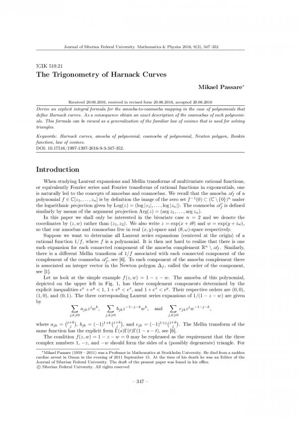 Библиографическое описание:Passare, Mikael. The Trigonometry of Harnack Curves = Тригонометрия гарнаковских кривых / M. Passare. - Текст : непосредственный // Журнал Сибирского федерального университета. Математика и физика. - 2016. - Т. 9, № 3. - С. 347-352. - Библиогр.: с. 352. - ISSN 1997-1397.