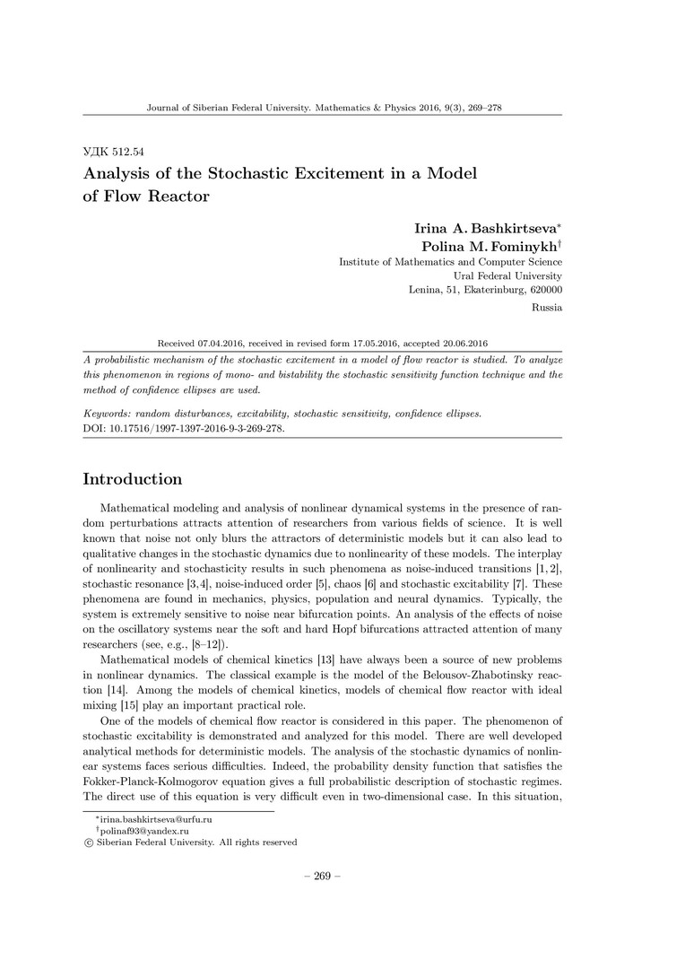 Библиографическое описание:Bashkirtseva, Irina. Analysis of the Stochastic Excitement in a Model of Flow Reactor = Анализ стохастической возбудимости в модели проточного реактора / I. A. Bashkirtseva, P. M. Fominykh. - Текст : непосредственный // Журнал Сибирского федерального университета. Математика и физика. - 2016. - Т. 9, № 3. - С. 269-278. - Библиогр.: с. 277-278. - ISSN 1997-1397.