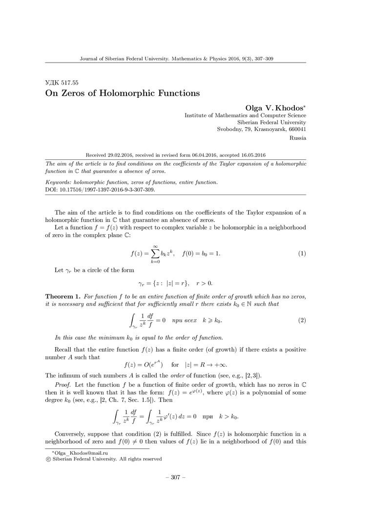 Библиографическое описание:Khodos, Olga. On Zeros of Holomorphic Functions = О нулях голоморфных функций / O. V. Khodos. - Текст : непосредственный // Журнал Сибирского федерального университета. Математика и физика. - 2016. - Т. 9, № 3. - С. 307-309. - Библиогр.: с. 309. - ISSN 1997-1397.