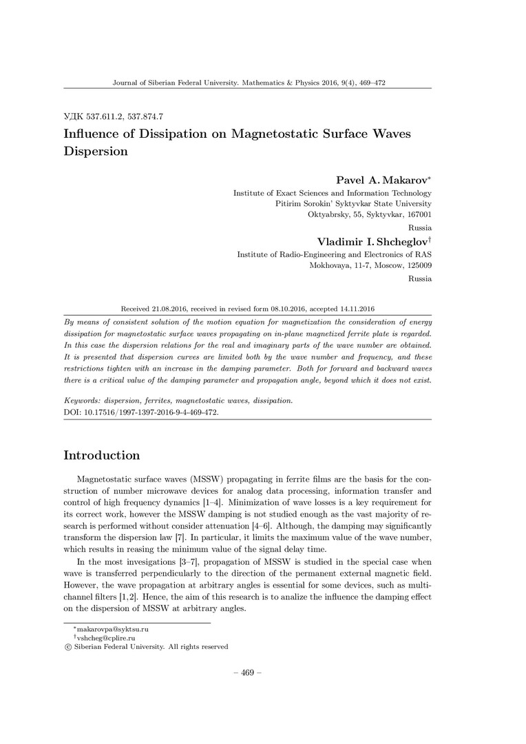 Библиографическое описание:Makarov, Pavel. Influence of Dissipation on Magnetostatic Surface Waves Dispersion = Влияние диссипации на дисперсию поверхностных магнитостатических волн / P. A. Makarov, V. I. Shcheglov. - Текст : непосредственный // Журнал Сибирского федерального университета. Математика и физика. - 2016. - Т. 9, № 4. - С. 469-472. - Библиогр.: с. 472. - ISSN 1997-1397.