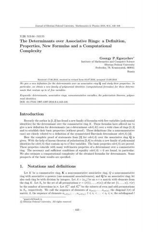 Библиографическое описание:Egorychev, Georgy. The Determinants over Associative Rings: a Definition, Properties, New Formulas and a Computational Complexity = Детерминанты над ассоциативными кольцами: определение, свойства, новые формулы и сложность вычисления / G. P. Egorychev. - Текст : непосредственный // Журнал Сибирского федерального университета. Математика и физика. - 2016. - Т. 9, № 4. - С. 443-448. - Библиогр.: с. 448. - ISSN 1997-1397.