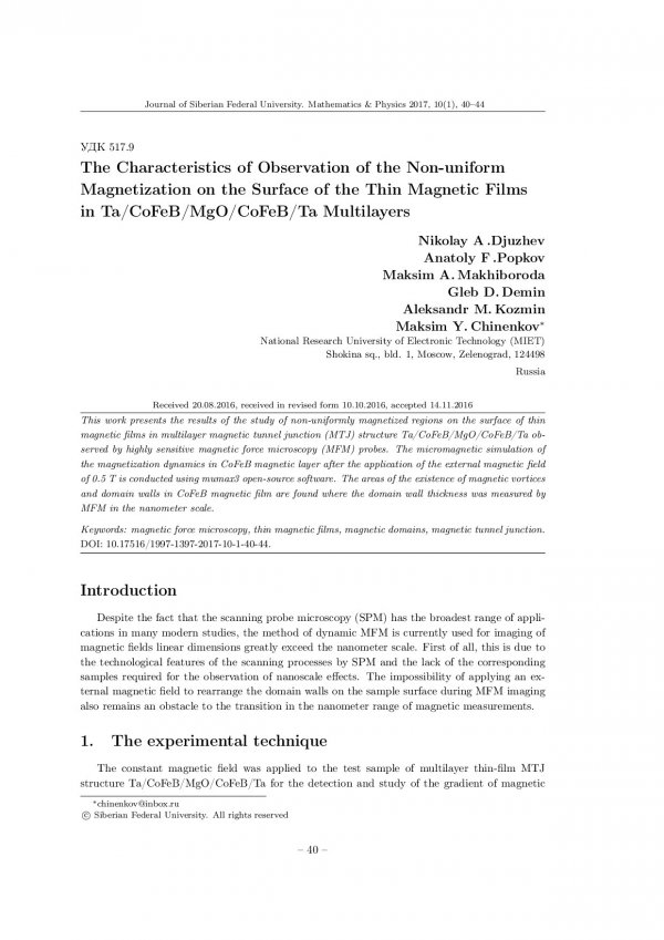 Библиографическое описание:The Characteristics of Observation of the Non-uniform Magnetization on the Surface of the Thin Magnetic Films in Ta/CoFeB/MgO/CoFeB/Ta Multilayers = Особенности наблюдения неоднородностей намагниченности на поверхности тонких магнитных пленок в Ta/CoFeB/MgO/CoFeB/Ta многослойных структурах / N. A. Djuzhev [et al.]. - Текст : непосредственный // Журнал Сибирского федерального университета. Математика и физика. - 2017. - Т. 10, № 1. - С. 40-44. - Библиогр.: с. 43. - ISSN 1997-1397.