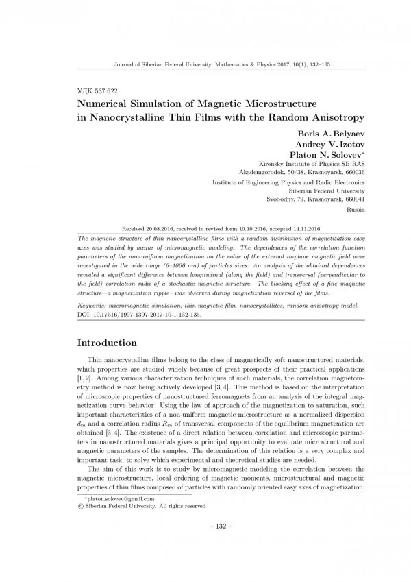 Библиографическое описание:Belyaev, Boris. Numerical Simulation of Magnetic Microstructure in Nanocrystalline Thin Films with the Random Anisotropy = Численное моделирование магнитной микроструктуры нанокристаллических тонких пленок со случайной анизотропией / B. A. Belyaev, A. V. Izotov, P. N. Solovev. - Текст : непосредственный // Журнал Сибирского федерального университета. Математика и физика. - 2017. - Т. 10, № 1. - С. 132-135. - Библиогр.: с. 134-135. - ISSN 1997-1397.