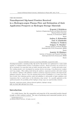 Библиографическое описание:Nanodispersed Mg-based Powders Received in a Hydrogen-argon Plasma Flow and Estimation of their Application Prospects as Hydrogen Storage Materials = Нанодисперсные порошки Mg, Mg-Ni, Mg-Pd, полученные в потоке водородоаргоновой плазмы и их характеристики / E. I. Melnikova [et al.]. - Текст : непосредственный // Журнал Сибирского федерального университета. Математика и физика. - 2017. - Т. 10, № 1. - С. 75-82. - Библиогр.: с. 81-82. - ISSN 1997-1397.