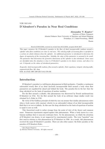 Библиографическое описание:Koptev, Alexander. D’Alembert’s Paradox in Near Real Conditions = Парадокс Даламбера в условиях, приближенных к реальным / A. V. Koptev. - Текст : непосредственный // Журнал Сибирского федерального университета. Математика и физика. - 2017. - Т. 10, № 2. - С. 170-180. - Библиогр.: с. 180. - ISSN 1997-1397.