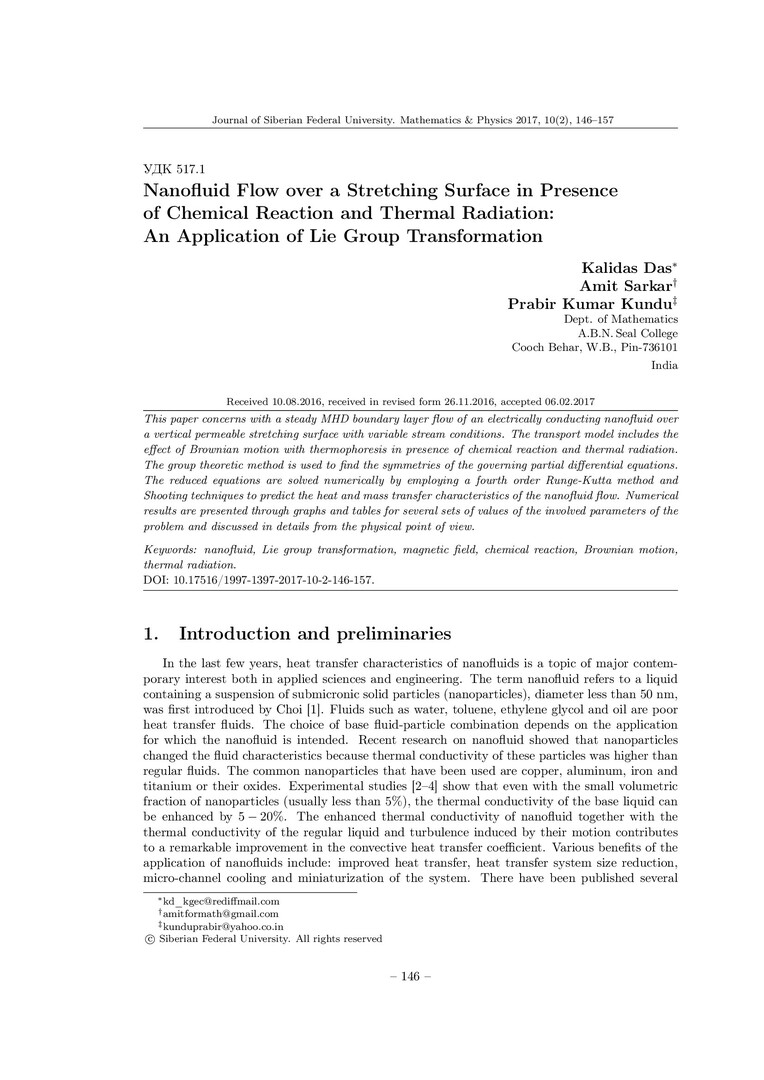 Библиографическое описание:Das, Kalidas. Nanofluid Flow over a Stretching Surface in Presence of Chemical Reaction and Thermal Radiation: An Application of Lie Group Transformation = Нанодисперсия обтекания над поверхностью растяжения с участием химической реакции и теплового излучения: применение преобразования группы Ли / Das, Kalidas; Sarkar, Amit; Kundu, Prabir Kumar. - Текст : непосредственный // Журнал Сибирского федерального университета. Математика и физика. - 2017. - Т. 10, № 2. - С. 146-157. - Библиогр.: с. 156-157. - ISSN 1997-1397.