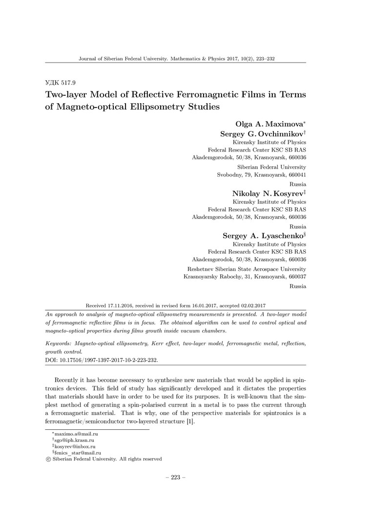 Библиографическое описание:Two-layer Model of Reflective Ferromagnetic Films in Terms of Magneto-optical Ellipsometry Studies = Двухслойная модель отражающих ферромагнитных пленок для исследования тонких пленок методом магнитоэллипсометрии / O. A. Maximova [et al.]. - Текст : непосредственный // Журнал Сибирского федерального университета. Математика и физика. - 2017. - Т. 10, № 2. - С. 223-232. - Библиогр.: с. 231-232. - ISSN 1997-1397.