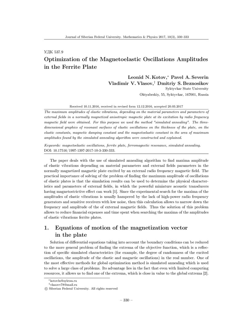 Библиографическое описание:Optimization of the Magnetoelastic Oscillations Amplitudes in the Ferrite Plate = Оптимизация амплитуды магнитоупругих колебаний в ферритовой пластине / L. N. Kotov [et al.]. - Текст : непосредственный // Журнал Сибирского федерального университета. Математика и физика. - 2017. - Т. 10, № 3. - С. 330-333. - Библиогр.: с. 333. - ISSN 1997-1397.